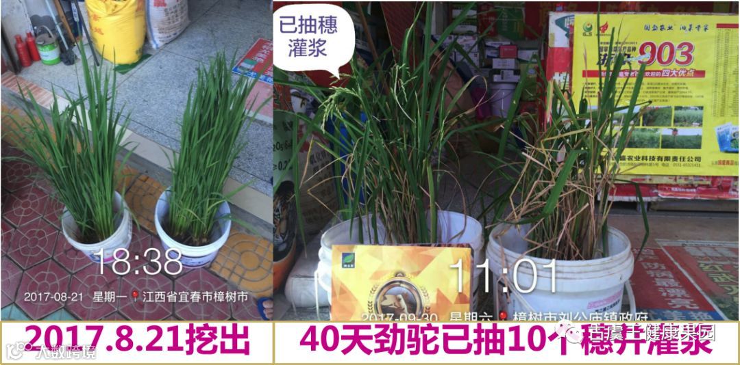 故事:2017年8月,樟树的零售商李文根为便于宣传劲驼,从农户田里挖了一棵劲驼水稻和一棵常规对照水稻,洗干净泥巴,放在桶里面,只提供水,进行观察,看看哪棵水稻死的快,以便检查水稻抗逆性。他每隔几天就拍一张照片,观察长势变化,一直跟踪到40多天,后来发现,用了劲驼的水稻竟然抽了10个穗并完成灌浆,对照的基本上已经枯死了,区别太大了,他马上打电话给我们,说劲驼真像一匹骆驼,他居然能在没有养分供应,而且是在弱光条件下,只有水的条件下,居然还能抽穗并完成灌浆,这是了不得的,假如是在大田环境下,只要不比桶里条件差,水稻就不会绝收。