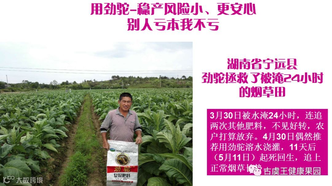 故事:湖南宁远县一个种烟草的农户,3月底烟田被大水淹了整整24小时,那个烟怎么也长不起来,追了几种肥料没见好转,农户基本上要放弃了,直到四月底,农户去了趟县城买农药,就跟零售店老板反映了烟田的情况,当时那个零售商正好手上接了劲驼肥料,觉得贵又不知道效果怎么样,难推,想到劲驼对根系好,就推荐给他试试,死马当活马医看看有没有用,农户拉了一包回去,直接就用下去,7天之后烟田起死回生长起来了,后来我们的业务员去烟田采访他,农户直接就上来一句话:这个劲驼肥料好,这对于我们烟农来说是最好的肥料,我130亩烟田全用上了。