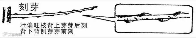 对于旺枝,可在发芽前进行刻芽,时间过早,冬季天冷,刻芽伤口会散失树体内的水分,且芽体失水受冻,严重者干枯死芽,最理想的时间应为萌芽前7~10天开始。根据枝条强旺的程度决定刻芽的方法。若枝条过于强旺,可采取芽芽刻。(如果必要还可以配合转枝、拉枝等其他措施)即就是除过枝条梢部瘦弱的芽和基部不需要出枝的部位不刻外,其余的芽全部刻。由于芽的异质性,刻芽时注意分清下面两种情况,枝条直立时,每个芽的情况相当,全部采用芽前刻方法。而当枝条横向生长时,由于背上和背下芽子的差异较大,背上的芽子容易萌发,背下的芽子不易萌发,所以刻芽时采用背下背侧芽芽前刻,背上芽芽后刻或不刻。这样处理以后,由于刻芽使该枝条上大部分芽子萌发,分流了养分,从而控制了枝条的旺长。