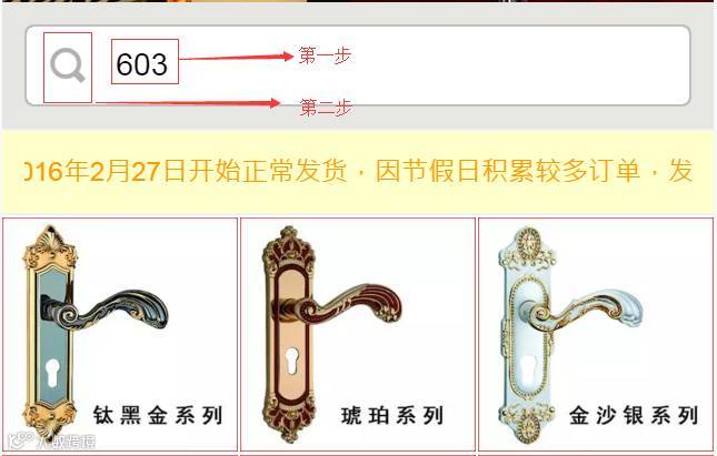 1 直接在五金商城首页点击进入对应的产品页,如想要锌合金的产品,直接点击“锌合金系列”,想要门吸合页直接点击“门吸合页”即可。