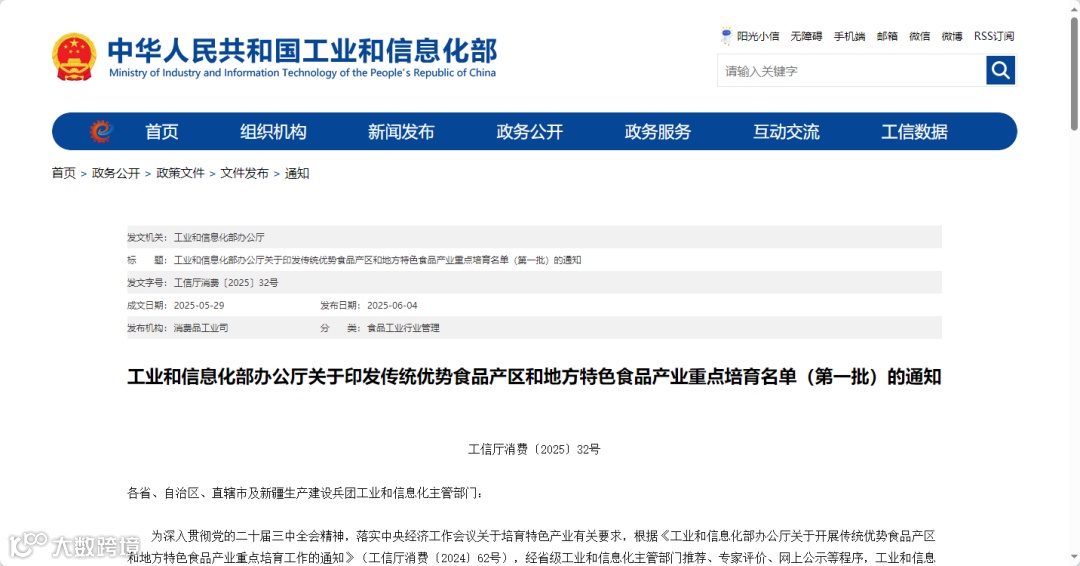 1、工信部发布《第一批传统优势食品产区和地方特色食品产业重点培育名单》