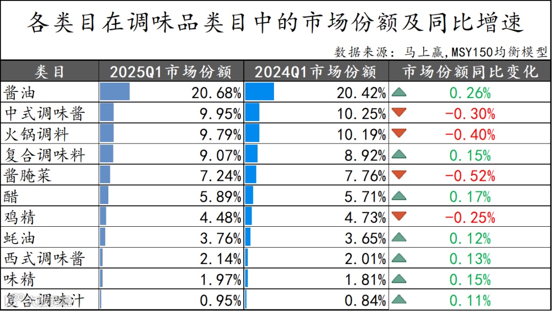 3、一季度中式调味酱、火锅调料和鸡精等份额下降