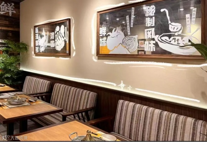 店内以浅米色墙壁为主色调,搭配深棕色木质护墙板和浅棕色餐桌,辅以暖白色灯带照明,整体空间洋溢着街边老店的亲切感与烟火气。