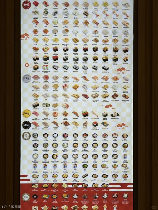 其菜单上寿司价格在 10 - 28 元左右,多数寿司 10 元一份,整体定价亲民。