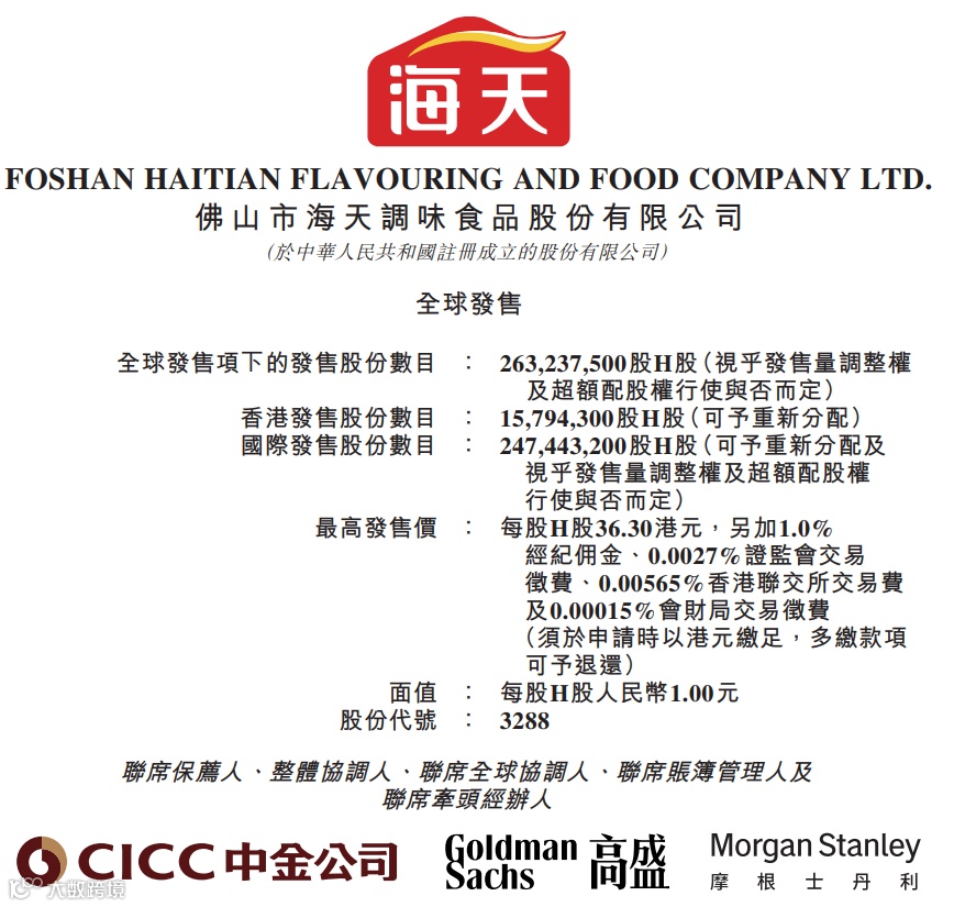 海天味业A股招股日的前一日(6月10日)收报41.07元,折合约44.94港元,以此计算,海天味业H股招股价起始折让19.2%至22.1%。海天味业拥有发售量调整权、超额配股权,如果悉数行使,集资额将升至126.4亿港元。