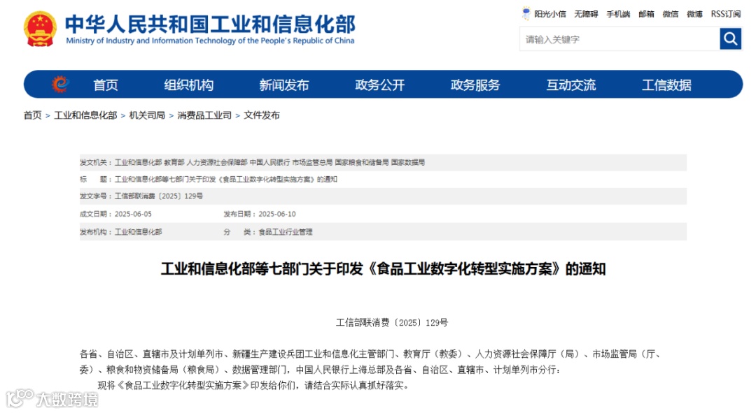 6月10日,工业和信息化部、教育部、人社部等七部门联合印发《食品工业数字化转型实施方案》,围绕信息技术创新应用、新模式新业态培育、产业提质升级、筑基聚力赋能等四大行动,细化部署18项具体措施,加快推动数字技术全面赋能食品工业发展。