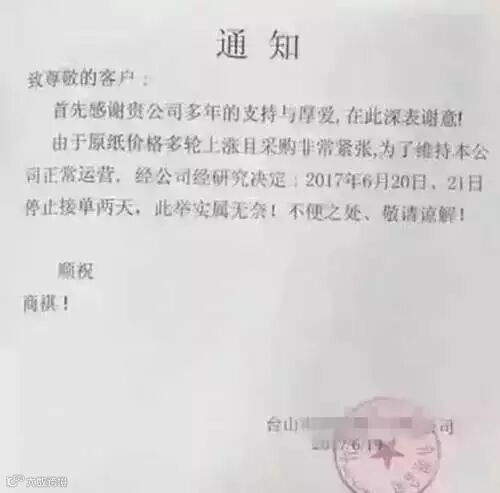 期间纸箱厂继去年断货走时价后,近日再次向渠道客户发函通知,由于原纸价格多轮上涨且采购非常紧张,为了维持公司运营,研究决定停止两天接单,此举实属无奈不便之处敬请谅解,从纸箱厂通知中可以看到,此轮涨价潮不会仅是涨幅一点而已,接下来五金建材厂商再次面临成本上涨及断货压力。