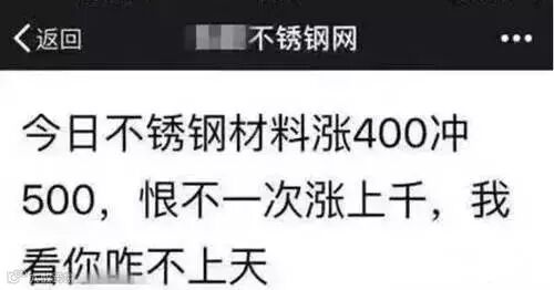 有媒体报道消息称,日前不锈钢材料涨400冲500,恨不一次涨上千,调侃称我看你怎么不上天呢,结果不到三天又被业内曝出,不锈钢大涨800,已经快要上千了。