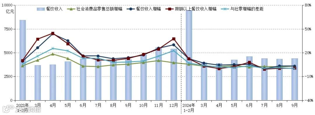 2024年1-9月,全国餐饮收入39415亿元,同比增长6.2%;限额以上单位餐饮收入11038亿元,同比增长3.6%。