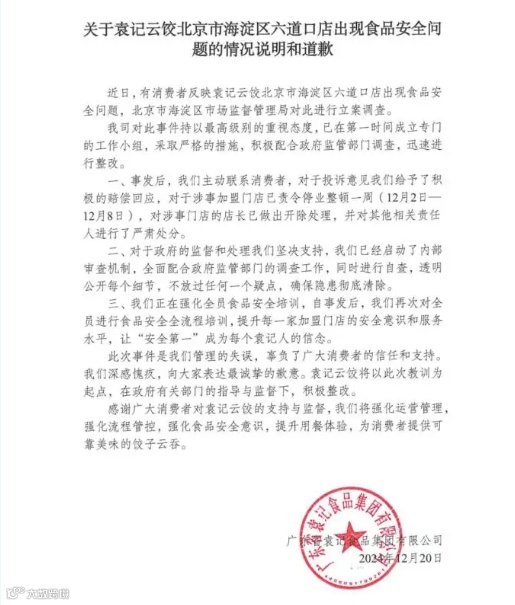 12月20日,袁记云饺官微发布关于北京市海淀区六道口店出现食品安全问题的情况说明和道歉。文中提到:事发后,已主动联系消费者,对于投诉意见给予了积极的赔偿回应,对于涉事加盟门店已责令停业整顿一周(12月2日-12月8日),对涉事门店的店长已做出开除处理,并对其他相关责任人进行了严肃处分。
