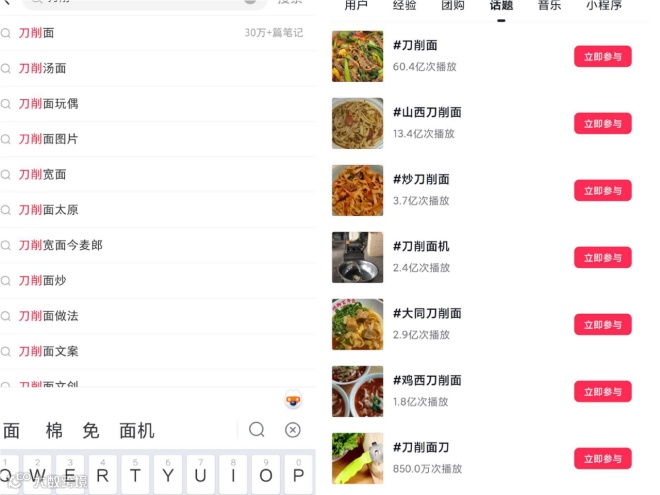 随着需求的激增,刀削面在媒体端也获得了巨大的曝光。如抖音上,有关刀削面的相关话题有近百亿的曝光,#刀削面 60.3 亿、#山西刀削面 13.4 亿、#炒刀削面 3.7 亿等等;在小红书,有关刀削面的种草笔记多达 30 多万篇,且还在激增。