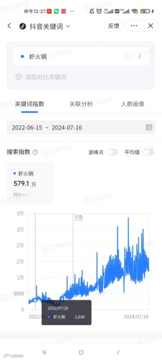 一方面,虾火锅在搜索端展现出显著的倍数级增长趋势。具体而言,根据巨量算法数据显示,其搜索指数从2022年6月的1889,飙升至2024年7月的14553,实现了超过12倍的惊人增长。