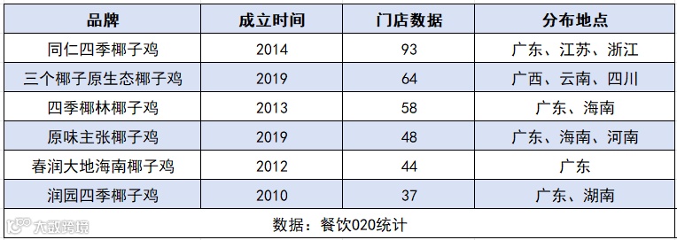 例如,同仁四季自2014年成立以来,已在广东等多个省市等多个省份开设了90多家门店;而三个椰子原生态椰子鸡,尽管成立于2019年,但在云南等地迅速扩张至64家门店。