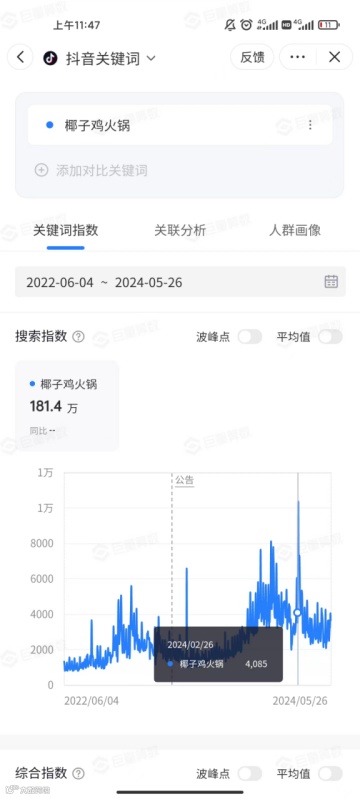 这些品牌的积极调整,进一步推动了椰子鸡火锅在需求端的快速增长。在搜索端,这一现象尤为显著,呈现出爆发式的增长态势。