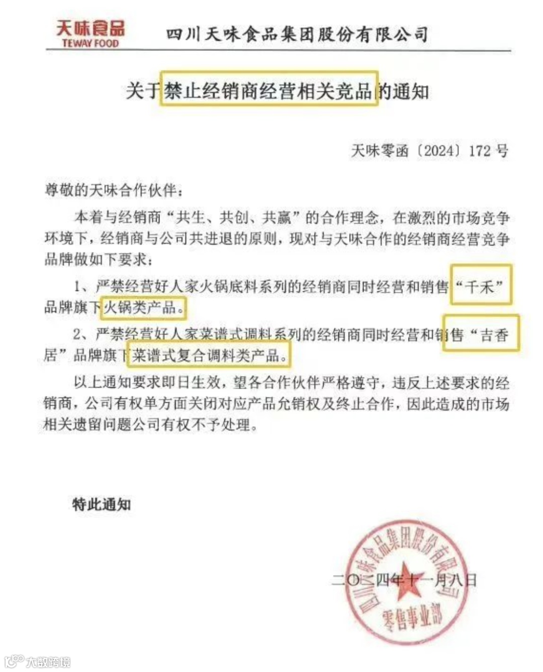 针对近日网传的由天味食品发布的《关于禁止经销商经营相关竞品的通知》,天味食品董秘何昌军回应:“《通知》不是公司名义发出去的,是我们下面的一个零售事业部发出的,没有经过我们后台的合规审核就发出,影响确实不太好。我们会从中汲取教训,进一步规范内部管控程序,始终坚持合法合规经营的准则。”