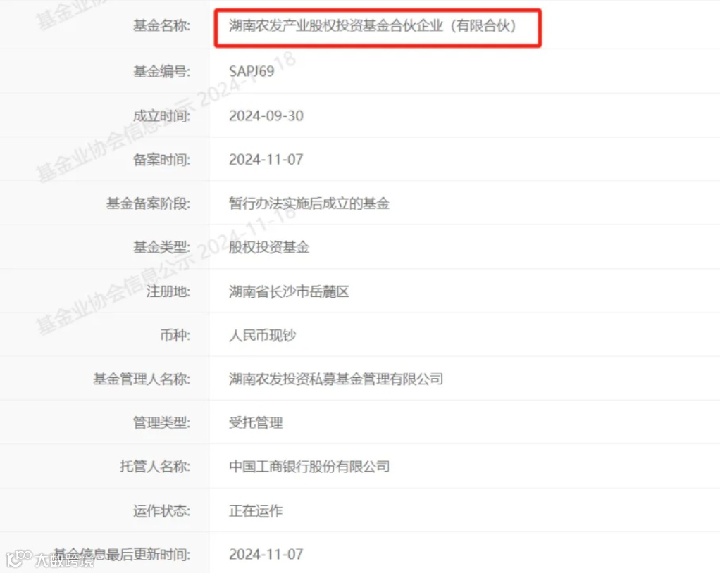 近日,由湖南农业发展投资集团有限责任公司(简称“湖南农业集团”)发起设立的湖南农发产业股权投资基金合伙企业(有限合伙)成功在中国证券投资基金业协会完成备案登记,母基金存续期15年,总规模30亿元,由湖南农业集团全资子公司湖南农发投资私募基金管理有限公司担任基金管理人和执行事务合伙人,主要投向农林牧渔、食品研发加工、生物农业、农业新材料、智慧农业等产业领域。