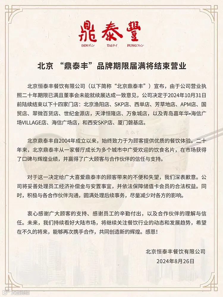 8月26日中午,公众号鼎泰丰DTF发布北京 “鼎泰丰”品牌期限届满将结束营业的消息。于2024年10月31日前,北京鼎泰丰将陆续结束以下十四家门店:北京渔阳店、SKP店、西单店、芳草地店、APM店、国贸店、翠微百货店、世纪金源店,天津恒隆店、万象城店,以及青岛嘉年华·海信广场VILLAGE店、海信广场店,和西安SKP店、厦门磐基店。