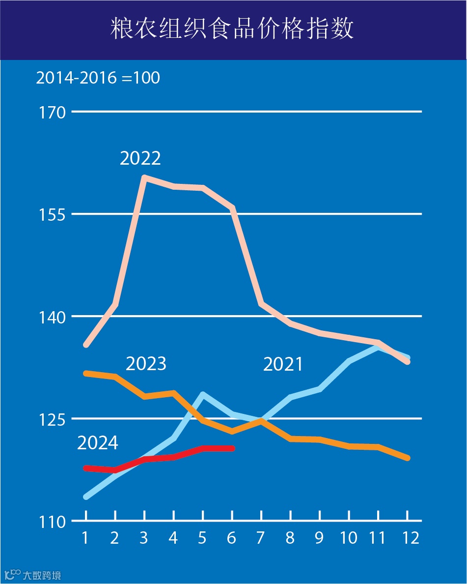 2024年6月,粮农组织食品价格指数平均为120.6点,和5月修订后的数值相同,与去年同期相比下跌2.5%,较2022年3月的历史高点下降24.8%。