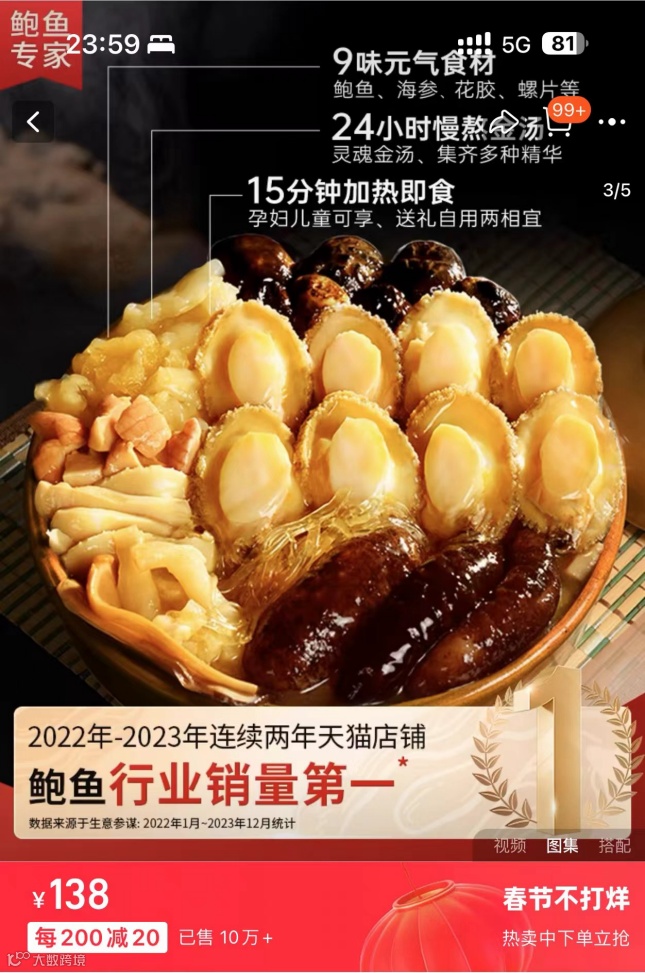 记者注意到,一款售价138元的金汤鲍参佛跳墙在某电商平台售出十万份,其配料十分丰富,含鲍鱼、海参、花胶、猪蹄筋、螺片、鱿鱼等,深受消费者欢迎。