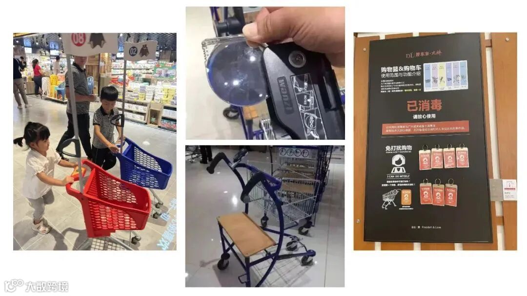 针对顾客消费层面,超市内备有可供不同人群使用的多达七种购物车。