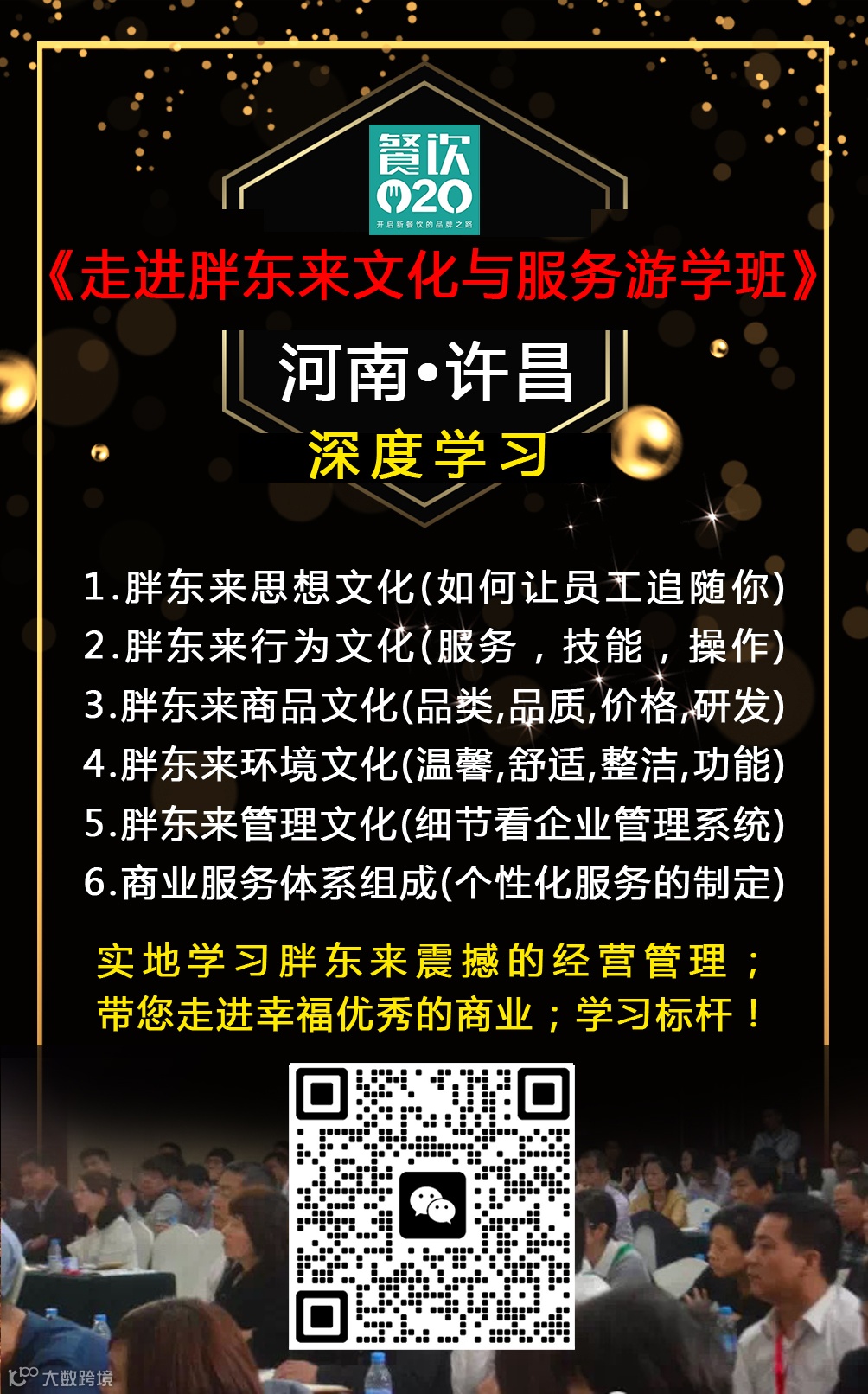 2024年,餐饮O2O重点组织企业游学胖东来,学习下半场餐饮的经营秘诀!龙年首次游学活动开启,让我们一起走进学习之旅!与品牌创始团队面对面互动交流,探寻万店餐企连锁扩张的核心秘籍。