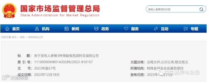 5、国家市场监管总局发布公告,将人参、西洋参、灵芝纳入保健食品备案原料目录
