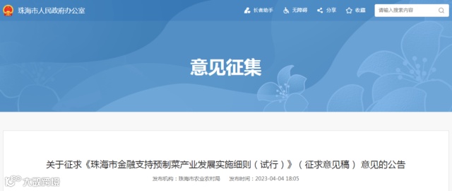 为贯彻落实《加快推进珠海市预制菜产业高质量发展若干措施》精神,强化金融服务预制菜产业发展功能,为珠海预制菜产业发展提供金融支撑,结合珠海实际,珠海市农业农村局起草形成《珠海市金融支持预制菜产业发展实施细则(试行)》(征求意见稿),以下简称《征求意见稿》,现公开征求意见。