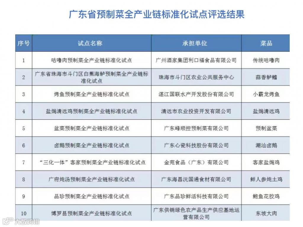 广府炖汤预制菜全产业链标准化试点、品珍预制菜全产业链标准化试点、博罗县预制菜全产业链标准化试点 10 个预制菜标准化试点单位。会上为获评企业颁发了预制菜全产业链标准化试点牌匾。