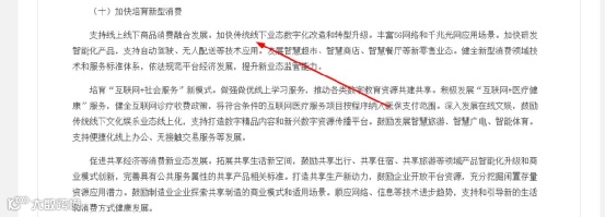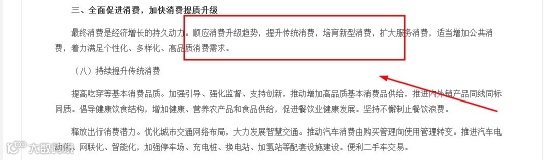 从汽车、旅游、医疗消费、教育消费到住房,到吃穿基础消费,倡导健康饮食结构,增加健康、营养农产品和食品供给,促进餐饮业健康发展。