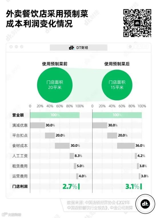 连锁饭店如此,外卖也一样。中金公司测算过。一家普通规格的外卖店,使用预制菜之后,食材成本占比会从30%提升至36%,但预制菜对厨房空间、厨师技能要求低,摊算下来,利润率反而能从2.7%增加到3.1%。