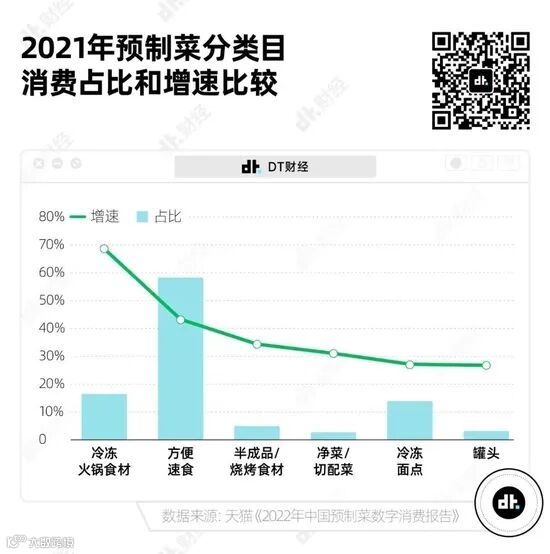 天猫发布的《2022中国预制菜数字消费报告》显示,2021年消费者最多的预制菜是方便速食(包括火腿肠、酱菜、卤蛋等),销售额占比接近60%,其次则是冷冻火锅食材(火锅肉片、丸类)和冷冻面点(速冻饺子、速冻馒头)。