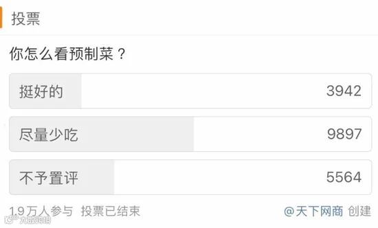 在一个1.9万人参与的“你怎么看预制菜?”微博调查中,仅有不到4000人认为预制菜挺好的,近1万人则认为要“尽量少吃”。不难看出消费者对预制菜的戒备心。
