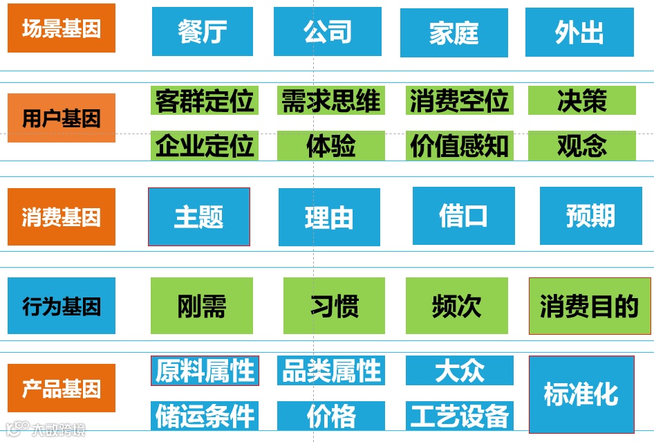 产品有很多基因,比如产品是否大众化,产品工艺设备是否复杂,产品的原料属性是否受季节限制,产品能否标准化,这一系列基因决定产品特性。
