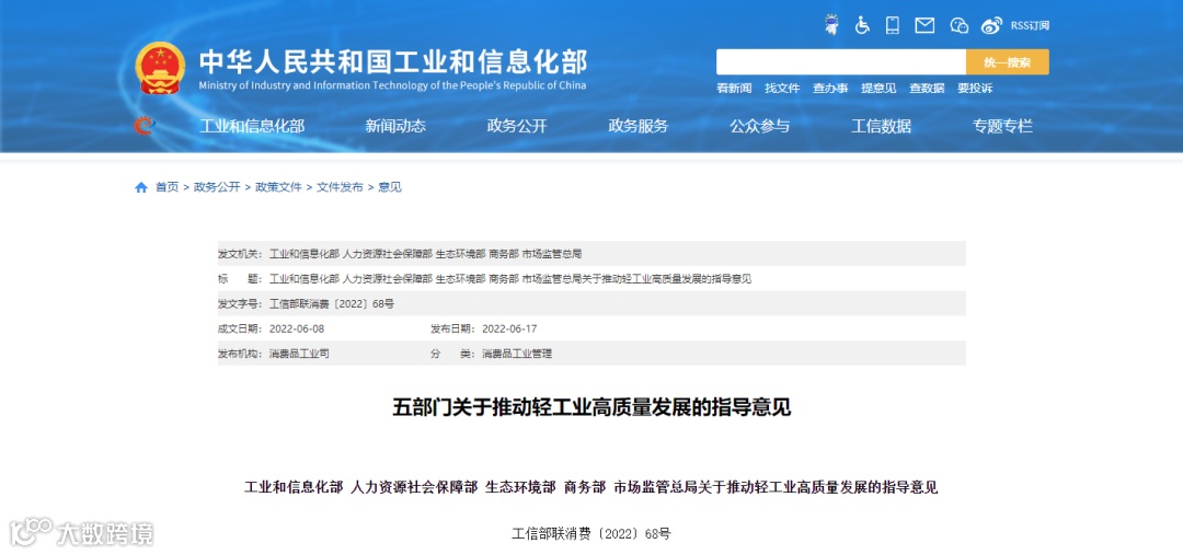 6月17日,工信部等五部门发布关于推动轻工业高质量发展的指导意见,意见提出发展目标,到2025年,轻工业综合实力显著提升,占工业比重基本稳定,扩内需、促消费的作用明显,服务构建新发展格局、促进经济社会高质量发展的能力增强。