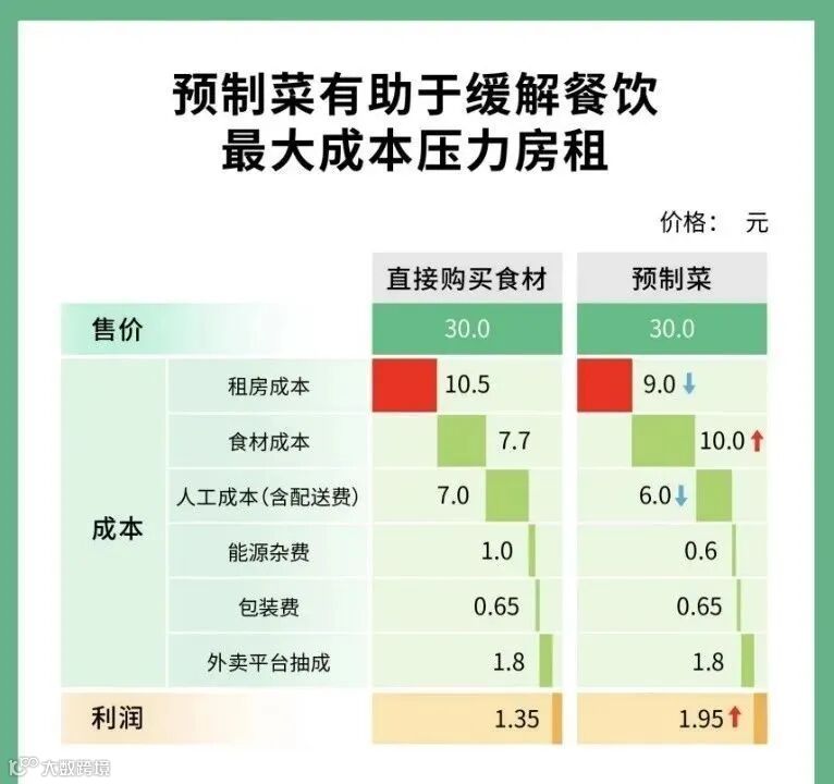 据专业分析机构测算,一家面积20平方米,主要经营外卖,日均80单、实际客单价35元的餐饮门店,在采用预制菜后,食材成本从25%提升到了33%,而人工成本、租赁成本、能源成本、运营费用的下降可以覆盖食材成本的提升,总体上提高门店的外卖利润率。
