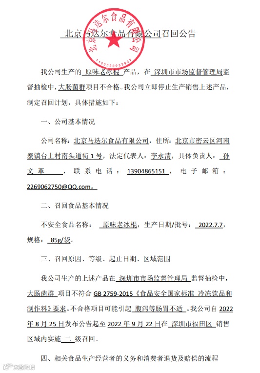 据公告,北京马迭尔食品有限公司生产的原味老冰棍产品,在深圳市市场监督管理局监督抽检中,大肠菌群项目不合格,该公司立即停止生产销售上述产品,并制定召回计划。消费者可使用有效凭证向该公司销售部门要求退货、赔偿等合法权利。
