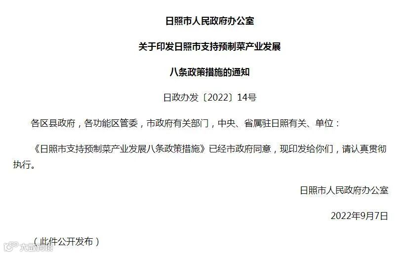 9月7日,日照市人民政府办公室发布《日照市支持预制菜产业发展八条政策措施》。