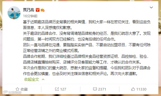 贾乃亮的声明中,甚至有对趣店的“谆谆教导”:要踏踏实实做产品,不要启动加盟项目,不要有任何除正常经营店铺之外的商业模式拓展。