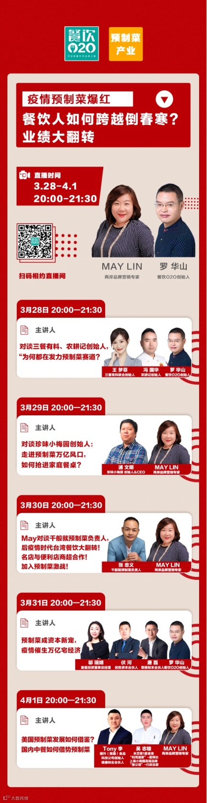 餐饮O2O创始人罗华山与两岸品牌营销专家May邀請预制菜产业上下游嘉宾,从品牌、供应链、资本、海外等维度深度解析火爆的预制菜产业链。