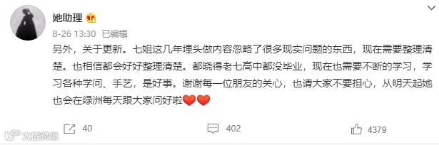对于断更原因,李子柒的助理曾发文解释:“七姐这几年埋头做内容忽略了