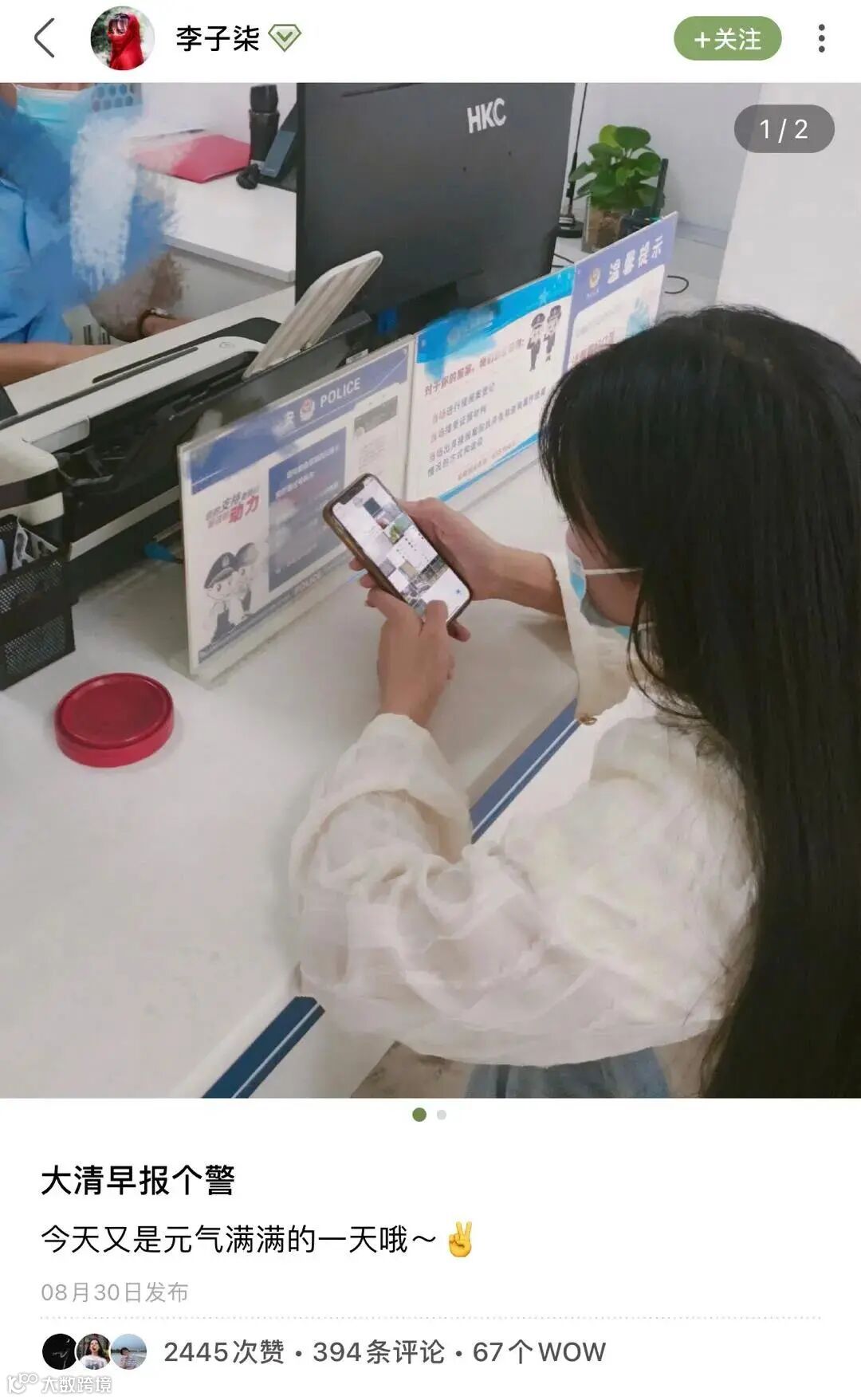第二天又发“大清早报个警”并晒出她本人在警局的照片,但没说明报警的原因是什么。