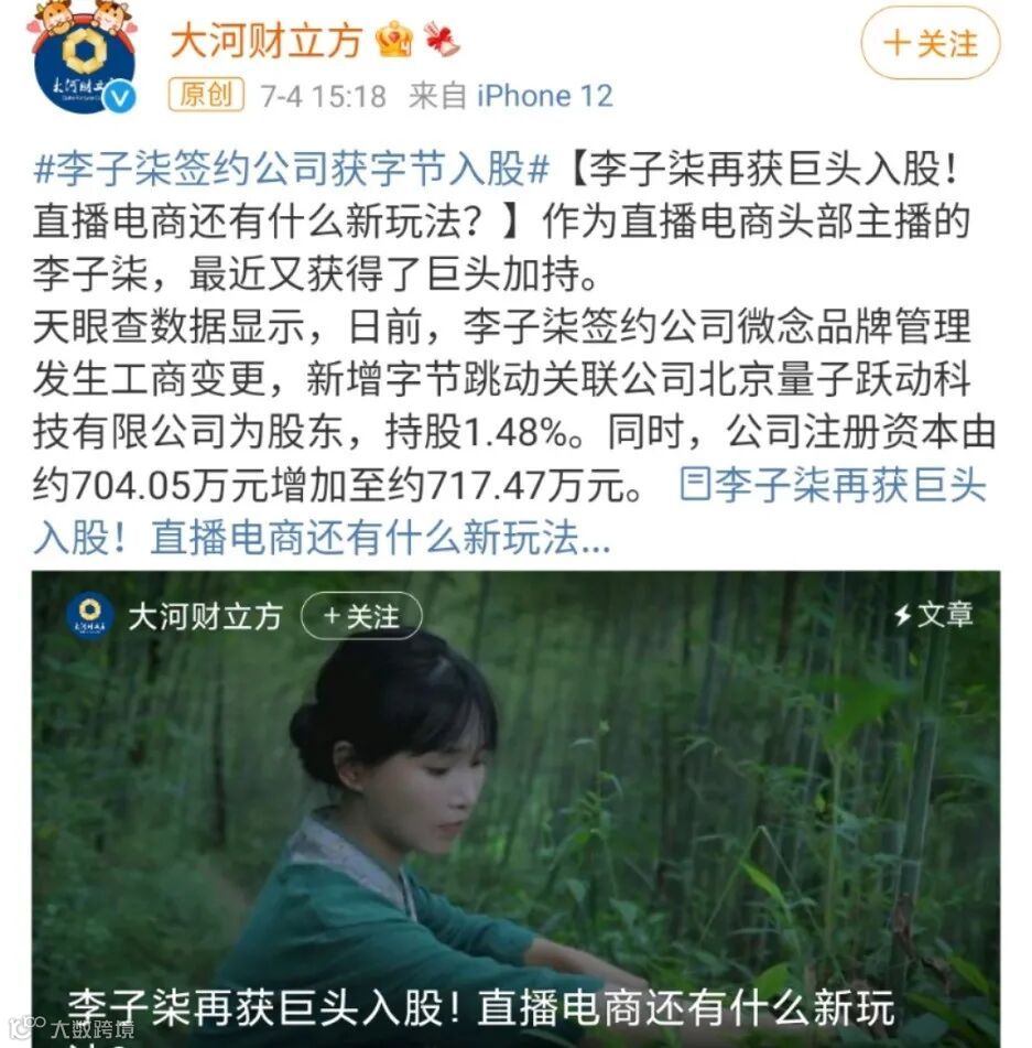 2020年7月,杭州微念成立了广西兴柳食品有限公司,其中微念持股70%,杭州创柳食品有限公司持股30%,在兴柳食品中李子柒也