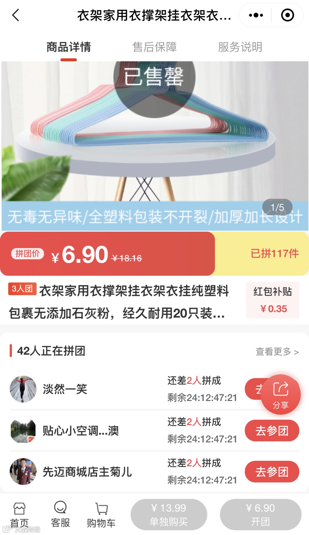 2、如果下方没有显示正在拼团的团,则表示该商品已经全部拼抢完毕,可以去别的商品开团或者参团。