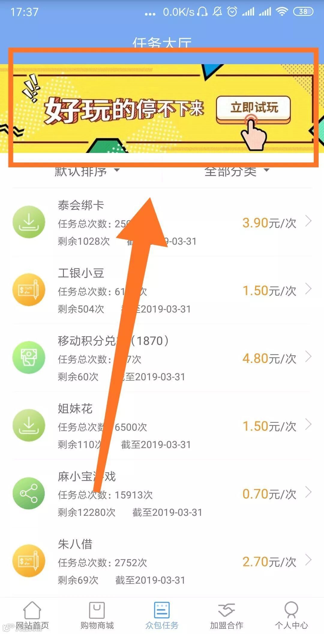 第一步:点击“众包任务”→App顶部广告图“立即试玩”→“游戏试玩列表”。