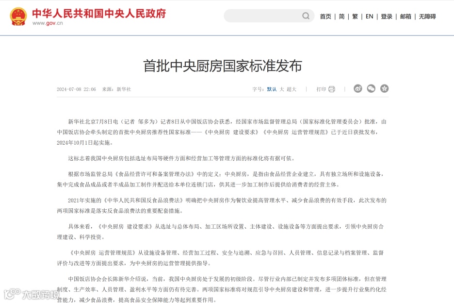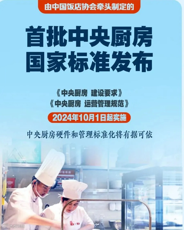 近日,经国家市场监督管理总局(国家标准化管理委员会)批准,由全国饮食服务业标准化技术委员会归口,中国饭店协会牵头制定的首批中央厨房推荐性国家标准——《中央厨房 建设要求》(GB/T 44142-2024)和《中央厨房 运营管理规范》(GB/T 44141-2024)已获批发布,将于2024年10月1日起实施。