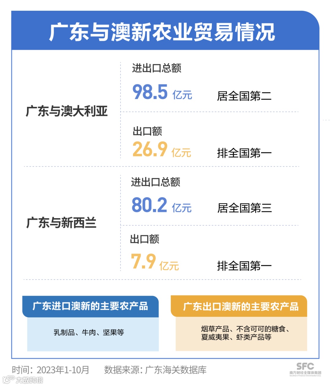 农产品进出口总额排名全国第二,达98.5亿元。同时,广东对新西兰的农产品出口额也排名全国第一;农产品进出口总额排名全国第三,达80.2亿元。