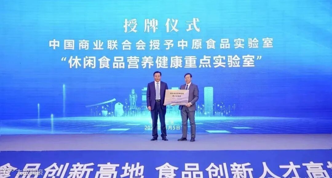 现场还举行了授牌仪式。中原食品实验室被中国食品工业协会授予“中国食品工业科技创新中心”牌匾,被中国商业联合会授予“休闲食品营养健康重点实验室”牌匾。