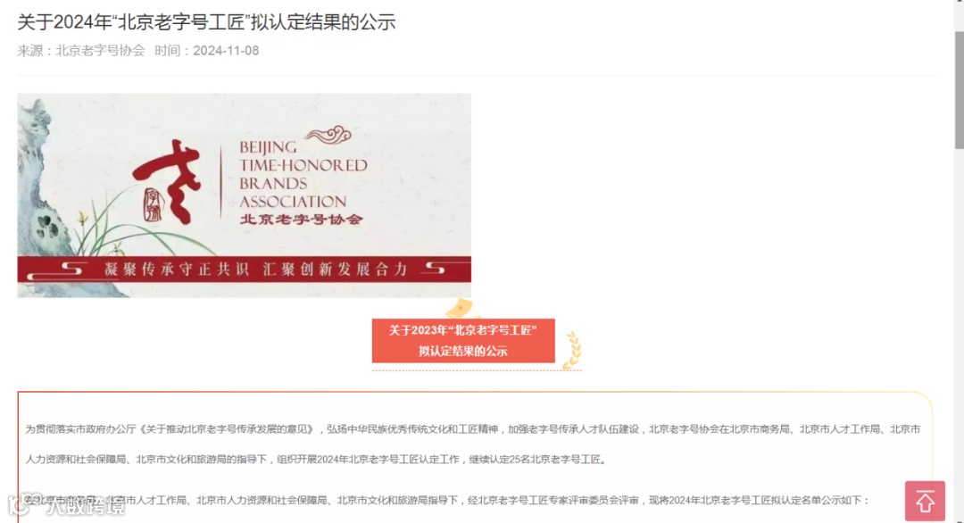 11月8日,北京老字号工匠认定工作小组发布关于2024年“北京老字号工匠”拟认定结果的公示,拟认定北京东来顺集团有限责任公司张磊、北京市四川饭店有限责任公司付立生、北京森隆餐饮有限责任公司郝春杰等25人为2024年“北京老字号工匠”。