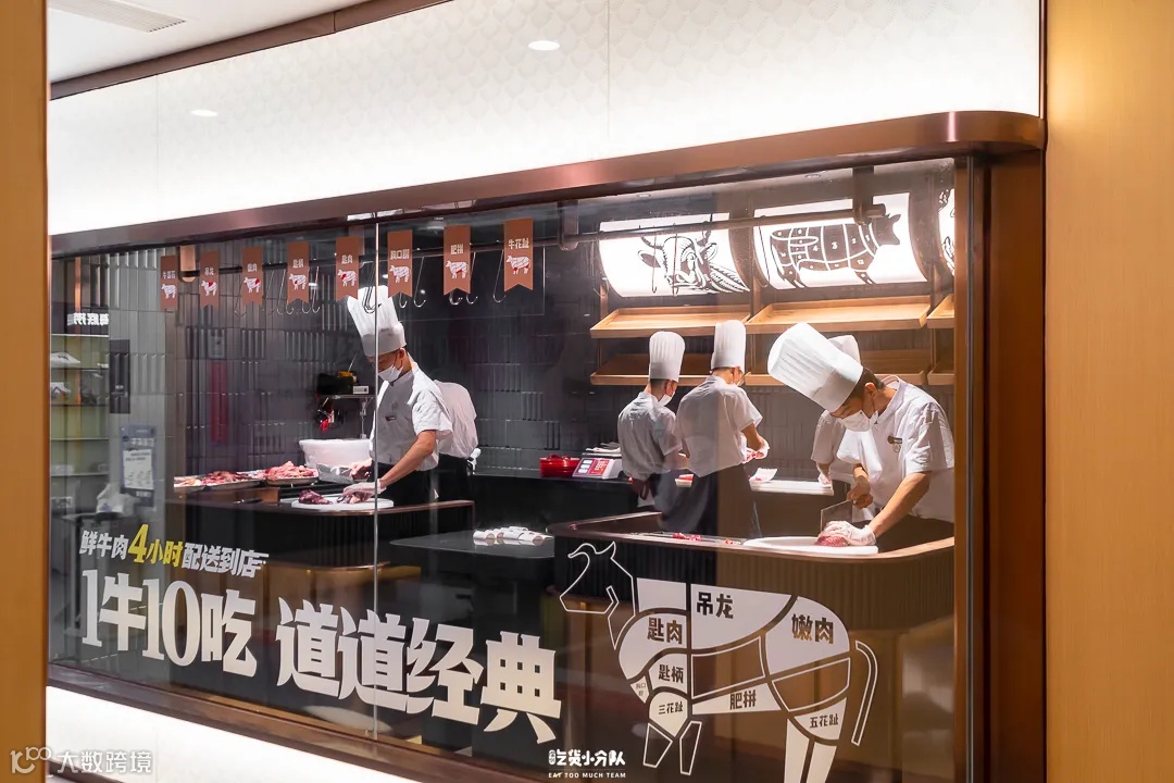 为凸显牛肉的新鲜度,店内特别设立了明档现切档口,厨师现场切割牛肉,确保顾客能够品尝到最新鲜的食材。门店各处更是显眼地标注了“鲜牛肉4小时配送到店”、“1牛10吃”等宣传语,进一步强调了其牛肉产品的优势。