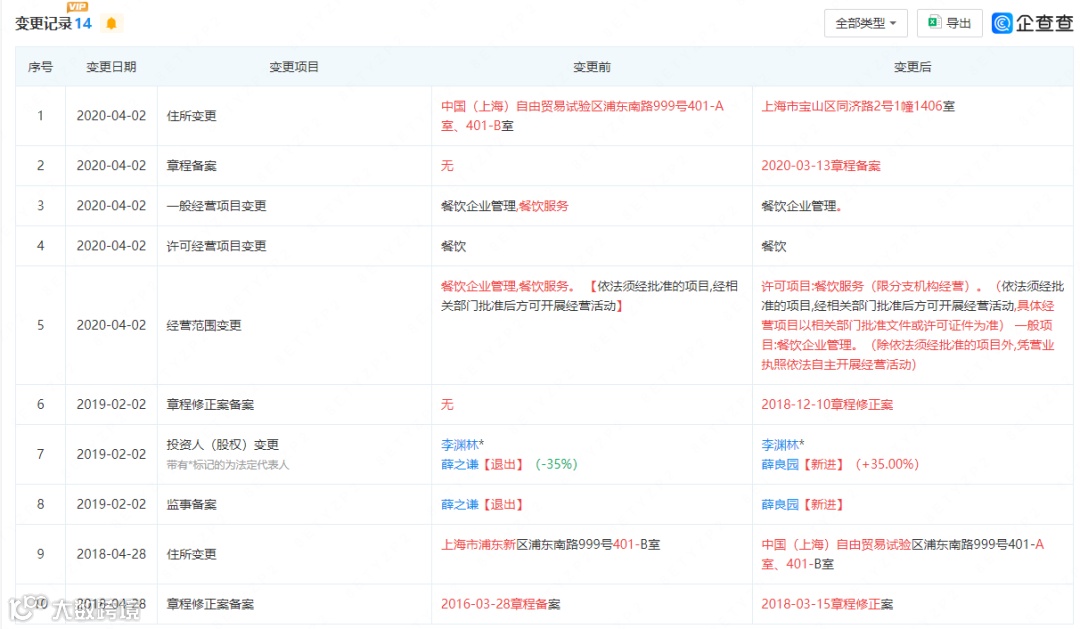 截至12月14日为止,该公司关联的上海弘和餐饮管理有限公司(2019年)、上海尚渊餐饮管理有限公司(2013年)的9家分公司中仅有2家为存续状态,其余7家均已注销。